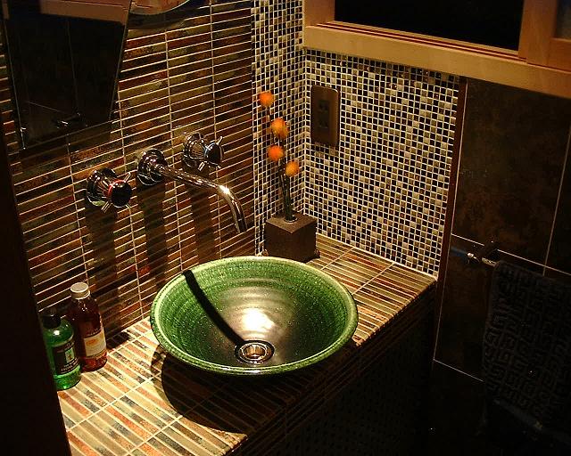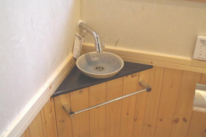 手洗はお客様のご友人が焼いたお皿で「ぜひ使って欲しい」との事で、穴加工は大変でしたが実現することができました。