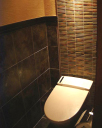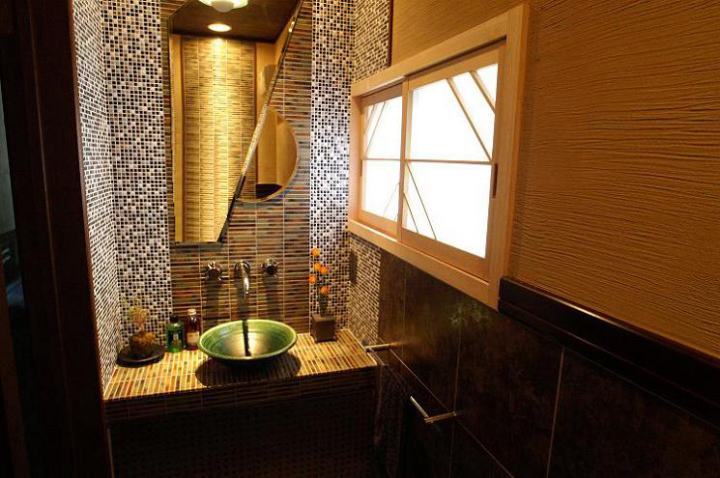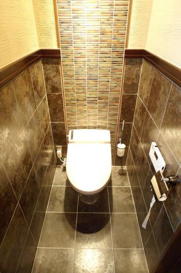当社こだわりの作品とも呼べる、和風のトイレです。タイルのカラーコーディネートにも気を使い、壁には珪藻土を塗り、